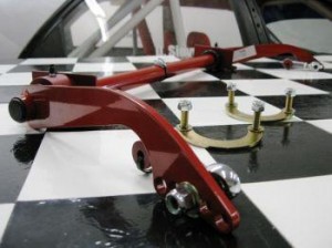 Urethane bushings, with concealed grease fitting in billet aluminium clamps that are machined to fit the aerodynamic undertray perfectly. Sliding aluminium clamps on the front bar allow infinite and quick adjustments.